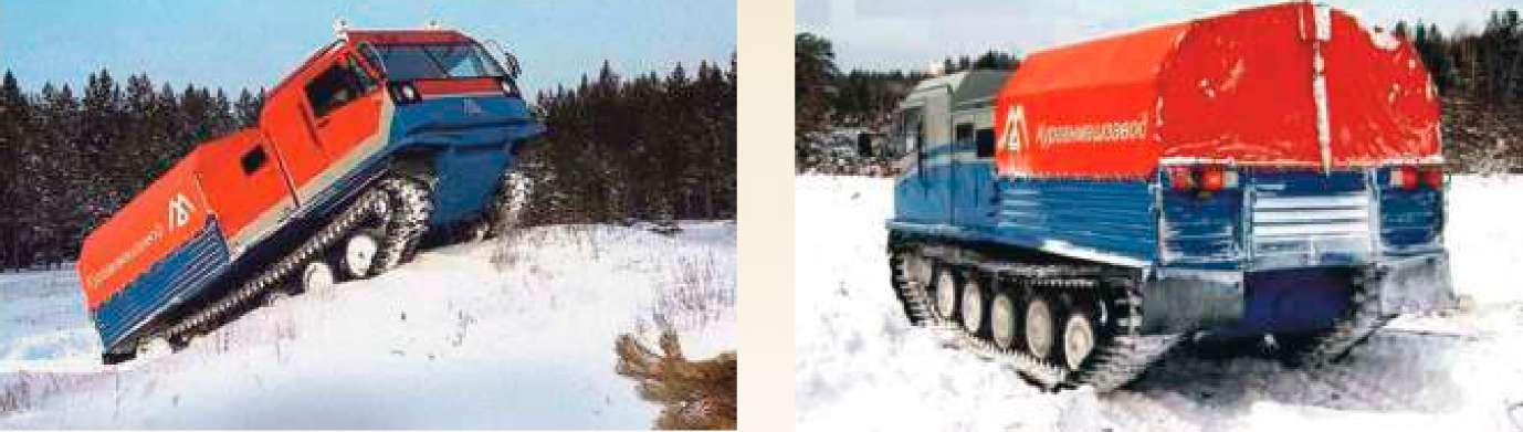 с РМШ и резинотканевыми уширителями. Обладает повышенным коэффициентом сцепления с грунтом, что повышает тяговые свойства машины на грунтах с низкой несущей способностью. Обеспечивает среднее удельное давление на грунт 0,2 кг/смг |