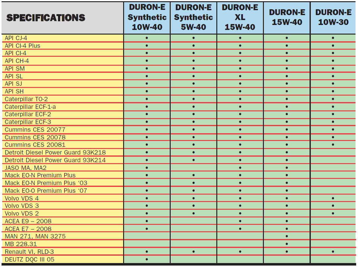 Линейка моторных масел для работы в тяжёлых условиях DURON-E производства компании Petro–Canada представляет собой высококачественные масла, превосходящие текущие требования API CJ-4 и пригодные для использования в малотоксичных двигателях, соответствующих требованиям ’07 EPA, в которых применяются современные методы обработки отработавших газов, такие как сажевые фильтры дизельных двигателей (diesel particulate filters, DPFs), с применением каталитического нейтрализатора (DOCs) или без него, а также метод увеличенной рециркуляции отработавших газов (Exhaust Gas Recirculation, EGR). Моторные масла для работы в тяжёлых условиях DURON–E также пригодны для использования в дизельных двигателях, работающих на топливе как с низким, так и со сверхнизким содержанием серы. DURON–E также может быть использовано для более старых двигателей (выпущенных до 2007 года) и там, где требуется применение масел, отвечающих API CI-4 Plus, CI-4, CH-4.