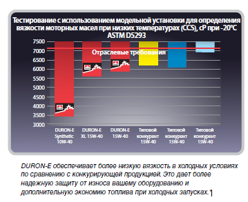 Полностью синтетическое всесезонное универсальное моторное масло для работы в тяжёлых условиях для дизельных и бензиновых двигателей. Благодаря современной системе присадок Duron-E Synthetic 10W–40 обладает высочайшей способностью диспергирования сажи и отличается увеличенными интервалами между заменами масла (превышающими стандартные интервалы производителя оборудования)*. Увеличивает топливную экономичность благодаря легкому запуску и пониженному вязкостному сопротивлению. Сочетает высокую прокачиваемость при - 35°C (требования класса вязкости 5W) и прекрасную защиту двигателя от износа при низком расходе масла.